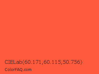 CIELab 60.171,60.115,50.756 Color is a light red color and the nearest color is Orange Soda #fa5b3d. Hex code #fc5a3a and RGB value is rgb(252,90,58). In RGB color space, this color is composed of 99% red, 35% green, 23% blue, In CMYK color space, this color is composed of 0% cyan, 64% magenta, 77% yellow , 1% black , In HSL color space, this color has a hue angle of 10° , 97% saturation and 61% lightness.