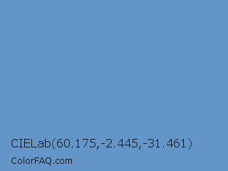 CIELab 60.175,-2.445,-31.461 Color is a normal blue color and the nearest color is Blue Gray #6699cc. Hex code #6395c8 and RGB value is rgb(99,149,200). In RGB color space, this color is composed of 39% red, 58% green, 78% blue, In CMYK color space, this color is composed of 51% cyan, 26% magenta, 0% yellow , 22% black , In HSL color space, this color has a hue angle of 210° , 48% saturation and 59% lightness.