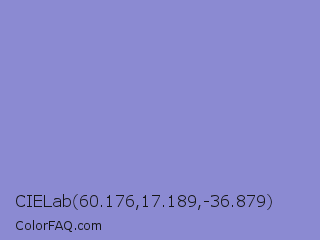 CIELab 60.176,17.189,-36.879 Color is a light indigo color and the nearest color is Chetwode Blue #8581d9. Hex code #8b8ad2 and RGB value is rgb(139,138,210). In RGB color space, this color is composed of 55% red, 54% green, 82% blue, In CMYK color space, this color is composed of 34% cyan, 34% magenta, 0% yellow , 18% black , In HSL color space, this color has a hue angle of 241° , 44% saturation and 68% lightness.