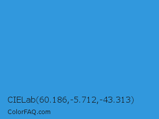 CIELab 60.186,-5.712,-43.313 Color is a normal blue color and the nearest color is Bleu De France #318ce7. Hex code #3198dd and RGB value is rgb(49,152,221). In RGB color space, this color is composed of 19% red, 60% green, 87% blue, In CMYK color space, this color is composed of 78% cyan, 31% magenta, 0% yellow , 13% black , In HSL color space, this color has a hue angle of 204° , 72% saturation and 53% lightness.