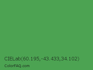 CIELab 60.195,-43.433,34.102 Color is a normal green color and the nearest color is Fruit Salad #4f9d5d. Hex code #4ca352 and RGB value is rgb(76,163,82). In RGB color space, this color is composed of 30% red, 64% green, 32% blue, In CMYK color space, this color is composed of 53% cyan, 0% magenta, 50% yellow , 36% black , In HSL color space, this color has a hue angle of 124° , 36% saturation and 47% lightness.