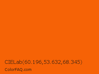 CIELab 60.196,53.632,68.345 Color is a normal orange color and the nearest color is Vivid Orange #ff5f00. Hex code #f66206 and RGB value is rgb(246,98,6). In RGB color space, this color is composed of 96% red, 38% green, 2% blue, In CMYK color space, this color is composed of 0% cyan, 60% magenta, 98% yellow , 4% black , In HSL color space, this color has a hue angle of 23° , 95% saturation and 49% lightness.