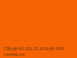 CIELab 60.201,52.824,68.439 Color is a normal orange color and the nearest color is Blaze Orange #ff6600. Hex code #f56305 and RGB value is rgb(245,99,5). In RGB color space, this color is composed of 96% red, 39% green, 2% blue, In CMYK color space, this color is composed of 0% cyan, 60% magenta, 98% yellow , 4% black , In HSL color space, this color has a hue angle of 24° , 96% saturation and 49% lightness.