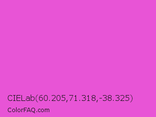 CIELab 60.205,71.318,-38.325 Color is a light magenta color and the nearest color is Purple Pizzazz #fe4eda. Hex code #e854d6 and RGB value is rgb(232,84,214). In RGB color space, this color is composed of 91% red, 33% green, 84% blue, In CMYK color space, this color is composed of 0% cyan, 64% magenta, 8% yellow , 9% black , In HSL color space, this color has a hue angle of 307° , 76% saturation and 62% lightness.