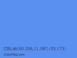 CIELab 60.206,11.087,-53.173 Color is a light blue color and the nearest color is United Nations Blue #5b92e5. Hex code #5a90ef and RGB value is rgb(90,144,239). In RGB color space, this color is composed of 35% red, 56% green, 94% blue, In CMYK color space, this color is composed of 62% cyan, 40% magenta, 0% yellow , 6% black , In HSL color space, this color has a hue angle of 218° , 82% saturation and 65% lightness.