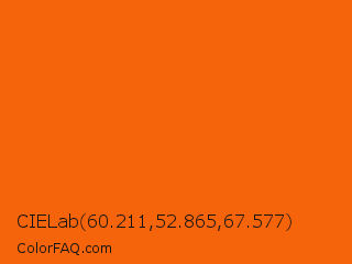 CIELab 60.211,52.865,67.577 Color is a normal orange color and the nearest color is Blaze Orange #ff6600. Hex code #f5630a and RGB value is rgb(245,99,10). In RGB color space, this color is composed of 96% red, 39% green, 4% blue, In CMYK color space, this color is composed of 0% cyan, 60% magenta, 96% yellow , 4% black , In HSL color space, this color has a hue angle of 23° , 92% saturation and 50% lightness.