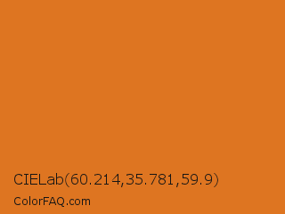 CIELab 60.214,35.781,59.9 Color is a normal orange color and the nearest color is Tango #ed7a1c. Hex code #de7521 and RGB value is rgb(222,117,33). In RGB color space, this color is composed of 87% red, 46% green, 13% blue, In CMYK color space, this color is composed of 0% cyan, 47% magenta, 85% yellow , 13% black , In HSL color space, this color has a hue angle of 27° , 74% saturation and 50% lightness.