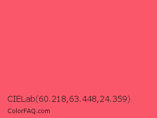 CIELab 60.218,63.448,24.359 Color is a light red color and the nearest color is Fiery Rose #ff5470. Hex code #fb576a and RGB value is rgb(251,87,106). In RGB color space, this color is composed of 98% red, 34% green, 42% blue, In CMYK color space, this color is composed of 0% cyan, 65% magenta, 58% yellow , 2% black , In HSL color space, this color has a hue angle of 353° , 95% saturation and 66% lightness.