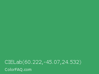 CIELab 60.222,-45.07,24.532 Color is a normal green color and the nearest color is Chateau Green #40a860. Hex code #3aa464 and RGB value is rgb(58,164,100). In RGB color space, this color is composed of 23% red, 64% green, 39% blue, In CMYK color space, this color is composed of 65% cyan, 0% magenta, 39% yellow , 36% black , In HSL color space, this color has a hue angle of 144° , 48% saturation and 44% lightness.