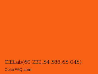 CIELab 60.232,54.588,65.045 Color is a normal orange color and the nearest color is Giants Orange #fe5a1d. Hex code #f76116 and RGB value is rgb(247,97,22). In RGB color space, this color is composed of 97% red, 38% green, 9% blue, In CMYK color space, this color is composed of 0% cyan, 61% magenta, 91% yellow , 3% black , In HSL color space, this color has a hue angle of 20° , 93% saturation and 53% lightness.