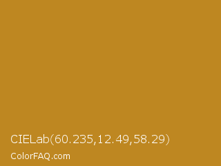 CIELab 60.235,12.49,58.29 Color is a normal orange color and the nearest color is University Of California Gold #b78727. Hex code #be8721 and RGB value is rgb(190,135,33). In RGB color space, this color is composed of 75% red, 53% green, 13% blue, In CMYK color space, this color is composed of 0% cyan, 29% magenta, 83% yellow , 25% black , In HSL color space, this color has a hue angle of 39° , 70% saturation and 44% lightness.
