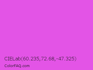 CIELab 60.235,72.68,-47.325 Color is a light magenta color and the nearest color is Purple Pizzazz #fe4eda. Hex code #e354e6 and RGB value is rgb(227,84,230). In RGB color space, this color is composed of 89% red, 33% green, 90% blue, In CMYK color space, this color is composed of 1% cyan, 63% magenta, 0% yellow , 10% black , In HSL color space, this color has a hue angle of 299° , 74% saturation and 62% lightness.