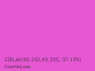 CIELab 60.242,69.335,-37.159 Color is a light magenta color and the nearest color is Purple Pizzazz #fe4eda. Hex code #e657d4 and RGB value is rgb(230,87,212). In RGB color space, this color is composed of 90% red, 34% green, 83% blue, In CMYK color space, this color is composed of 0% cyan, 62% magenta, 8% yellow , 10% black , In HSL color space, this color has a hue angle of 308° , 74% saturation and 62% lightness.