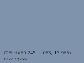 CIELab 60.245,-1.063,-15.965 Color is a normal blue color and the nearest color is Weldon Blue #7c98ab. Hex code #7f93ad and RGB value is rgb(127,147,173). In RGB color space, this color is composed of 50% red, 58% green, 68% blue, In CMYK color space, this color is composed of 27% cyan, 15% magenta, 0% yellow , 32% black , In HSL color space, this color has a hue angle of 214° , 22% saturation and 59% lightness.