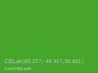 CIELab 60.257,-49.917,50.601 Color is a normal green color and the nearest color is Apple #4fa83d. Hex code #46a52e and RGB value is rgb(70,165,46). In RGB color space, this color is composed of 27% red, 65% green, 18% blue, In CMYK color space, this color is composed of 58% cyan, 0% magenta, 72% yellow , 35% black , In HSL color space, this color has a hue angle of 108° , 56% saturation and 41% lightness.