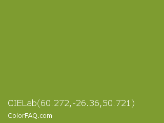 CIELab 60.272,-26.36,50.721 Color is a normal lime color and the nearest color is Sushi #87ab39. Hex code #7e9c30 and RGB value is rgb(126,156,48). In RGB color space, this color is composed of 49% red, 61% green, 19% blue, In CMYK color space, this color is composed of 19% cyan, 0% magenta, 69% yellow , 39% black , In HSL color space, this color has a hue angle of 77° , 53% saturation and 40% lightness.