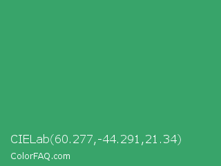 CIELab 60.277,-44.291,21.34 Color is a normal green color and the nearest color is Chateau Green #40a860. Hex code #38a46a and RGB value is rgb(56,164,106). In RGB color space, this color is composed of 22% red, 64% green, 42% blue, In CMYK color space, this color is composed of 66% cyan, 0% magenta, 35% yellow , 36% black , In HSL color space, this color has a hue angle of 148° , 49% saturation and 43% lightness.