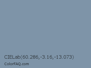 CIELab 60.286,-3.16,-13.073 Color is a normal blue color and the nearest color is Weldon Blue #7c98ab. Hex code #7e94a8 and RGB value is rgb(126,148,168). In RGB color space, this color is composed of 49% red, 58% green, 66% blue, In CMYK color space, this color is composed of 25% cyan, 12% magenta, 0% yellow , 34% black , In HSL color space, this color has a hue angle of 209° , 19% saturation and 58% lightness.