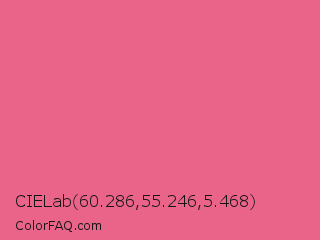 CIELab 60.286,55.246,5.468 Color is a light rose color and the nearest color is Light Crimson #f56991. Hex code #ea648a and RGB value is rgb(234,100,138). In RGB color space, this color is composed of 92% red, 39% green, 54% blue, In CMYK color space, this color is composed of 0% cyan, 57% magenta, 41% yellow , 8% black , In HSL color space, this color has a hue angle of 343° , 76% saturation and 65% lightness.