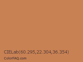 CIELab 60.295,22.304,36.354 Color is a normal orange color and the nearest color is Deer #ba8759. Hex code #c78152 and RGB value is rgb(199,129,82). In RGB color space, this color is composed of 78% red, 51% green, 32% blue, In CMYK color space, this color is composed of 0% cyan, 35% magenta, 59% yellow , 22% black , In HSL color space, this color has a hue angle of 24° , 51% saturation and 55% lightness.