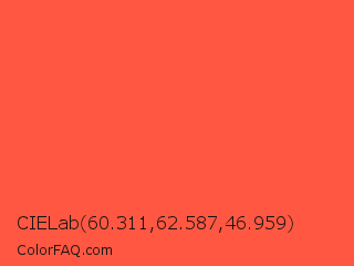 CIELab 60.311,62.587,46.959 Color is a light red color and the nearest color is Ogre Odor #fd5240. Hex code #ff5742 and RGB value is rgb(255,87,66). In RGB color space, this color is composed of 100% red, 34% green, 26% blue, In CMYK color space, this color is composed of 0% cyan, 66% magenta, 74% yellow , 0% black , In HSL color space, this color has a hue angle of 7° , 100% saturation and 63% lightness.