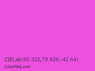 CIELab 60.322,73.929,-42.64 Color is a light magenta color and the nearest color is Purple Pizzazz #fe4eda. Hex code #e951de and RGB value is rgb(233,81,222). In RGB color space, this color is composed of 91% red, 32% green, 87% blue, In CMYK color space, this color is composed of 0% cyan, 65% magenta, 5% yellow , 9% black , In HSL color space, this color has a hue angle of 304° , 78% saturation and 62% lightness.