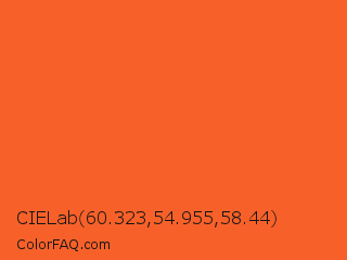 CIELab 60.323,54.955,58.44 Color is a normal orange color and the nearest color is Flamingo #f2552a. Hex code #f76129 and RGB value is rgb(247,97,41). In RGB color space, this color is composed of 97% red, 38% green, 16% blue, In CMYK color space, this color is composed of 0% cyan, 61% magenta, 83% yellow , 3% black , In HSL color space, this color has a hue angle of 16° , 93% saturation and 56% lightness.