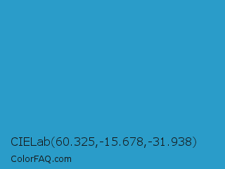 CIELab 60.325,-15.678,-31.938 Color is a normal blue color and the nearest color is Curious Blue #2596d1. Hex code #2a9cc9 and RGB value is rgb(42,156,201). In RGB color space, this color is composed of 16% red, 61% green, 79% blue, In CMYK color space, this color is composed of 79% cyan, 22% magenta, 0% yellow , 21% black , In HSL color space, this color has a hue angle of 197° , 65% saturation and 48% lightness.