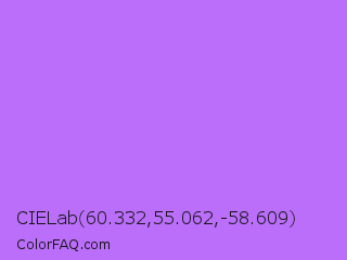 CIELab 60.332,55.062,-58.609 Color is a light purple color and the nearest color is Lavender #b57edc. Hex code #ba6efa and RGB value is rgb(186,110,250). In RGB color space, this color is composed of 73% red, 43% green, 98% blue, In CMYK color space, this color is composed of 26% cyan, 56% magenta, 0% yellow , 2% black , In HSL color space, this color has a hue angle of 273° , 93% saturation and 71% lightness.