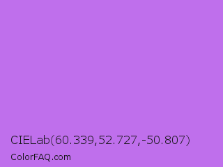 CIELab 60.339,52.727,-50.807 Color is a light purple color and the nearest color is Lavender #b57edc. Hex code #bf6fec and RGB value is rgb(191,111,236). In RGB color space, this color is composed of 75% red, 44% green, 93% blue, In CMYK color space, this color is composed of 19% cyan, 53% magenta, 0% yellow , 7% black , In HSL color space, this color has a hue angle of 278° , 77% saturation and 68% lightness.