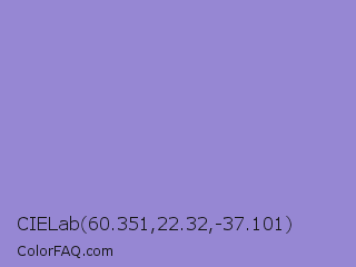 CIELab 60.351,22.32,-37.101 Color is a light indigo color and the nearest color is Chetwode Blue #8581d9. Hex code #9687d3 and RGB value is rgb(150,135,211). In RGB color space, this color is composed of 59% red, 53% green, 83% blue, In CMYK color space, this color is composed of 29% cyan, 36% magenta, 0% yellow , 17% black , In HSL color space, this color has a hue angle of 252° , 46% saturation and 68% lightness.