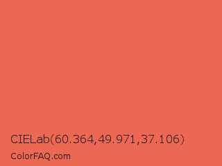 CIELab 60.364,49.971,37.106 Color is a light red color and the nearest color is Burnt Sienna #e97451. Hex code #ed6853 and RGB value is rgb(237,104,83). In RGB color space, this color is composed of 93% red, 41% green, 33% blue, In CMYK color space, this color is composed of 0% cyan, 56% magenta, 65% yellow , 7% black , In HSL color space, this color has a hue angle of 8° , 81% saturation and 63% lightness.