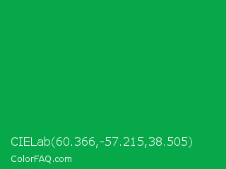 CIELab 60.366,-57.215,38.505 Color is a normal green color and the nearest color is Green Pigment #00a550. Hex code #07a849 and RGB value is rgb(7,168,73). In RGB color space, this color is composed of 3% red, 66% green, 29% blue, In CMYK color space, this color is composed of 96% cyan, 0% magenta, 57% yellow , 34% black , In HSL color space, this color has a hue angle of 145° , 92% saturation and 34% lightness.