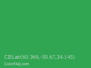 CIELab 60.369,-50.67,34.145 Color is a normal green color and the nearest color is Chateau Green #40a860. Hex code #31a652 and RGB value is rgb(49,166,82). In RGB color space, this color is composed of 19% red, 65% green, 32% blue, In CMYK color space, this color is composed of 70% cyan, 0% magenta, 51% yellow , 35% black , In HSL color space, this color has a hue angle of 137° , 54% saturation and 42% lightness.