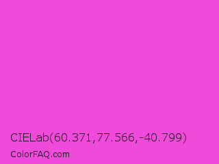 CIELab 60.371,77.566,-40.799 Color is a light magenta color and the nearest color is Purple Pizzazz #fe4eda. Hex code #f04adb and RGB value is rgb(240,74,219). In RGB color space, this color is composed of 94% red, 29% green, 86% blue, In CMYK color space, this color is composed of 0% cyan, 69% magenta, 9% yellow , 6% black , In HSL color space, this color has a hue angle of 308° , 85% saturation and 62% lightness.