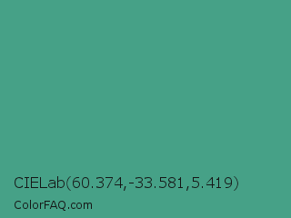 CIELab 60.374,-33.581,5.419 Color is a normal green color and the nearest color is Zomp #39a78e. Hex code #46a187 and RGB value is rgb(70,161,135). In RGB color space, this color is composed of 27% red, 63% green, 53% blue, In CMYK color space, this color is composed of 57% cyan, 0% magenta, 16% yellow , 37% black , In HSL color space, this color has a hue angle of 163° , 39% saturation and 45% lightness.