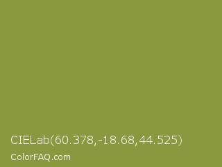 CIELab 60.378,-18.68,44.525 Color is a normal yellow color and the nearest color is Sycamore #908d39. Hex code #8a993f and RGB value is rgb(138,153,63). In RGB color space, this color is composed of 54% red, 60% green, 25% blue, In CMYK color space, this color is composed of 10% cyan, 0% magenta, 59% yellow , 40% black , In HSL color space, this color has a hue angle of 70° , 42% saturation and 42% lightness.