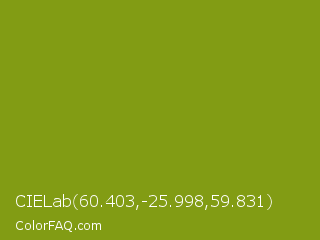 CIELab 60.403,-25.998,59.831 Color is a normal lime color and the nearest color is Trendy Green #7c881a. Hex code #829c14 and RGB value is rgb(130,156,20). In RGB color space, this color is composed of 51% red, 61% green, 8% blue, In CMYK color space, this color is composed of 17% cyan, 0% magenta, 87% yellow , 39% black , In HSL color space, this color has a hue angle of 71° , 77% saturation and 35% lightness.