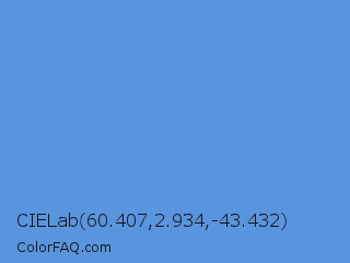 CIELab 60.407,2.934,-43.432 Color is a light blue color and the nearest color is United Nations Blue #5b92e5. Hex code #5994de and RGB value is rgb(89,148,222). In RGB color space, this color is composed of 35% red, 58% green, 87% blue, In CMYK color space, this color is composed of 60% cyan, 33% magenta, 0% yellow , 13% black , In HSL color space, this color has a hue angle of 213° , 67% saturation and 61% lightness.