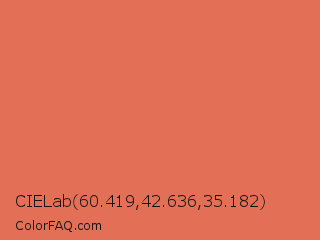 CIELab 60.419,42.636,35.182 Color is a light red color and the nearest color is Terracotta #e2725b. Hex code #e37056 and RGB value is rgb(227,112,86). In RGB color space, this color is composed of 89% red, 44% green, 34% blue, In CMYK color space, this color is composed of 0% cyan, 51% magenta, 62% yellow , 11% black , In HSL color space, this color has a hue angle of 11° , 72% saturation and 61% lightness.