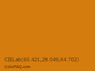 CIELab 60.421,28.049,64.702 Color is a normal orange color and the nearest color is Meteor #d07d12. Hex code #d57c0e and RGB value is rgb(213,124,14). In RGB color space, this color is composed of 84% red, 49% green, 5% blue, In CMYK color space, this color is composed of 0% cyan, 42% magenta, 93% yellow , 16% black , In HSL color space, this color has a hue angle of 33° , 88% saturation and 45% lightness.