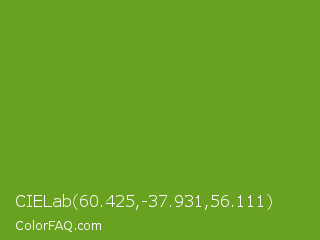 CIELab 60.425,-37.931,56.111 Color is a normal green color and the nearest color is Christi #67a712. Hex code #69a120 and RGB value is rgb(105,161,32). In RGB color space, this color is composed of 41% red, 63% green, 13% blue, In CMYK color space, this color is composed of 35% cyan, 0% magenta, 80% yellow , 37% black , In HSL color space, this color has a hue angle of 86° , 67% saturation and 38% lightness.