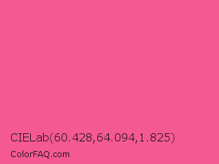CIELab 60.428,64.094,1.825 Color is a light rose color and the nearest color is Violet Red #f75394. Hex code #f55991 and RGB value is rgb(245,89,145). In RGB color space, this color is composed of 96% red, 35% green, 57% blue, In CMYK color space, this color is composed of 0% cyan, 64% magenta, 41% yellow , 4% black , In HSL color space, this color has a hue angle of 338° , 89% saturation and 65% lightness.