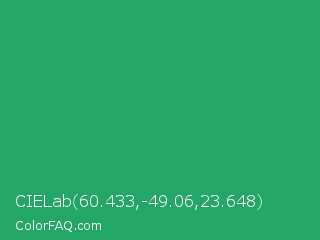 CIELab 60.433,-49.06,23.648 Color is a normal green color and the nearest color is Green Crayola #1cac78. Hex code #24a666 and RGB value is rgb(36,166,102). In RGB color space, this color is composed of 14% red, 65% green, 40% blue, In CMYK color space, this color is composed of 78% cyan, 0% magenta, 39% yellow , 35% black , In HSL color space, this color has a hue angle of 150° , 64% saturation and 40% lightness.
