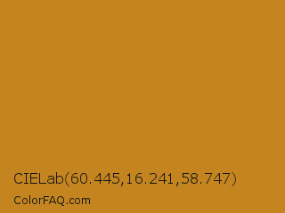 CIELab 60.445,16.241,58.747 Color is a normal orange color and the nearest color is Brandy Punch #cd8429. Hex code #c48521 and RGB value is rgb(196,133,33). In RGB color space, this color is composed of 77% red, 52% green, 13% blue, In CMYK color space, this color is composed of 0% cyan, 32% magenta, 83% yellow , 23% black , In HSL color space, this color has a hue angle of 37° , 71% saturation and 45% lightness.