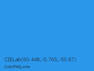 CIELab 60.448,-0.765,-50.67 Color is a normal blue color and the nearest color is Button Blue #24a0ed. Hex code #2a97eb and RGB value is rgb(42,151,235). In RGB color space, this color is composed of 16% red, 59% green, 92% blue, In CMYK color space, this color is composed of 82% cyan, 36% magenta, 0% yellow , 8% black , In HSL color space, this color has a hue angle of 206° , 83% saturation and 54% lightness.