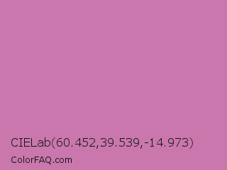 CIELab 60.452,39.539,-14.973 Color is a light magenta color and the nearest color is Sky Magenta #cf71af. Hex code #c977ad and RGB value is rgb(201,119,173). In RGB color space, this color is composed of 79% red, 47% green, 68% blue, In CMYK color space, this color is composed of 0% cyan, 41% magenta, 14% yellow , 21% black , In HSL color space, this color has a hue angle of 320° , 43% saturation and 63% lightness.