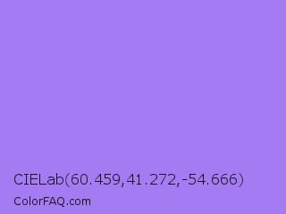 CIELab 60.459,41.272,-54.666 Color is a light violet color and the nearest color is Lavender #b57edc. Hex code #a57bf3 and RGB value is rgb(165,123,243). In RGB color space, this color is composed of 65% red, 48% green, 95% blue, In CMYK color space, this color is composed of 32% cyan, 49% magenta, 0% yellow , 5% black , In HSL color space, this color has a hue angle of 261° , 83% saturation and 72% lightness.