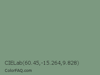 CIELab 60.45,-15.264,9.828 Color is a normal green color and the nearest color is Amulet #7b9f80. Hex code #7c9980 and RGB value is rgb(124,153,128). In RGB color space, this color is composed of 49% red, 60% green, 50% blue, In CMYK color space, this color is composed of 19% cyan, 0% magenta, 16% yellow , 40% black , In HSL color space, this color has a hue angle of 128° , 12% saturation and 54% lightness.