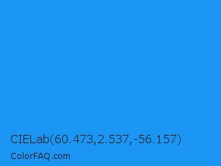 CIELab 60.473,2.537,-56.157 Color is a normal blue color and the nearest color is Dodger Blue #1e90ff. Hex code #1c96f5 and RGB value is rgb(28,150,245). In RGB color space, this color is composed of 11% red, 59% green, 96% blue, In CMYK color space, this color is composed of 89% cyan, 39% magenta, 0% yellow , 4% black , In HSL color space, this color has a hue angle of 206° , 92% saturation and 54% lightness.